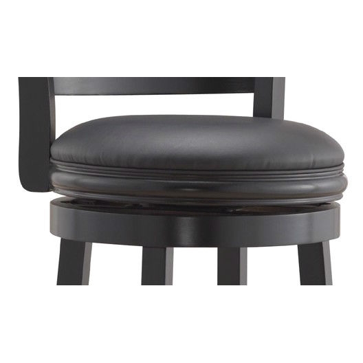 Accent your bar space with this classy and stylish Black 29-inch Swivel Seat Barstool with Faux Leather Cushion Seat. Its attractive and durable design is a perfect fit for all decor settings. It occupies less space and proves highly useful when you have guests at home.This stool has a solid hardwood construction that ensures it lasts for many years to come. The lustrous finish lends it a timeless look and adds to the appeal. It is fitted with a rich faux leather seat with high density foam to offer comfortable seating and enhance its appearance. It has flawlessly crafted French style legs with tempered bottoms. The steel ball bearings keeps it steady. The swivel ensures unrestricted movement. While the full ring footrest lends more strength and stability. The back support makes the seating experience more relaxed.The bar stool has a weight capacity of 250lbs. Its seat height is 29''. The overall dimensions of the bar stool are 43.5'' in height, 17'' in width and 18'' in depth. It is available in different shades to best suit your decor. This stool is best paired with an elegant bar table to complete the sophisticated look of your decor.